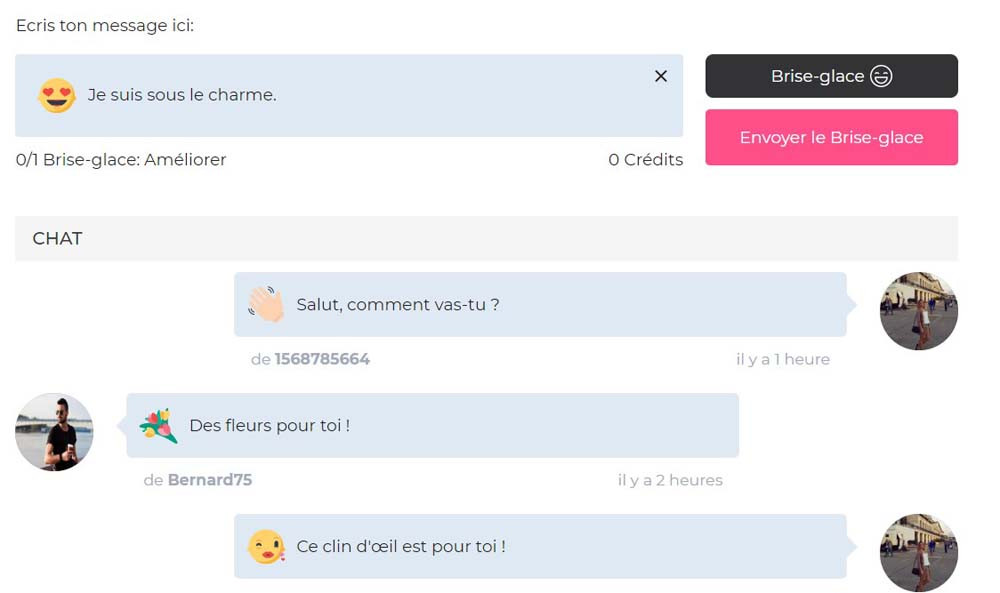 Et pour ceux qui veulent payer en fonction de leur utilisation, c’est possible, grâce à l’achat de crédits. Pour envoyer un brise-glace, comptez 2 crédits. Et pour envoyer un message, alors il faudra utiliser 10 crédits.