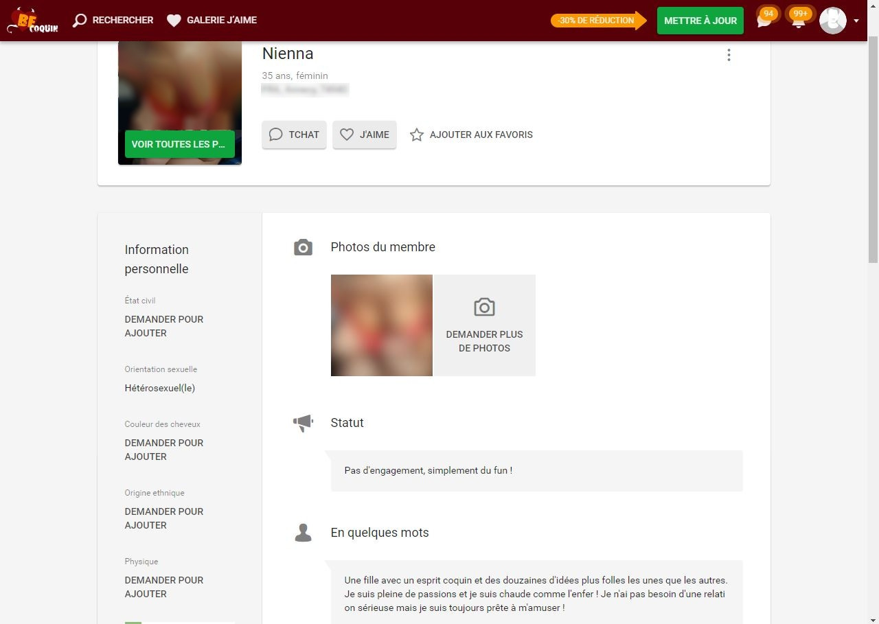 Après ma rupture avec mon mec, j’avais pas envie de me lancer à nouveau dans une relation sérieuse. Je voulais juste prendre du bon temps sans m’attacher. J’ai cherché un site de rencontre pour adultes histoire de pas trop me prendre la tête et j’ai vu un avis sur Becoquin plutôt positif donc j’ai décidé de tester. Grâce à Be Coquin j’ai pu aligner les rencontres sans lendemain sans me justifier et sans me faire juger. Souvent des mecs différents, parfois j’en revois un que j’ai déjà vu, mais en tout cas aucune histoire sérieuse, juste du sexe et ça me convient tout à fait !